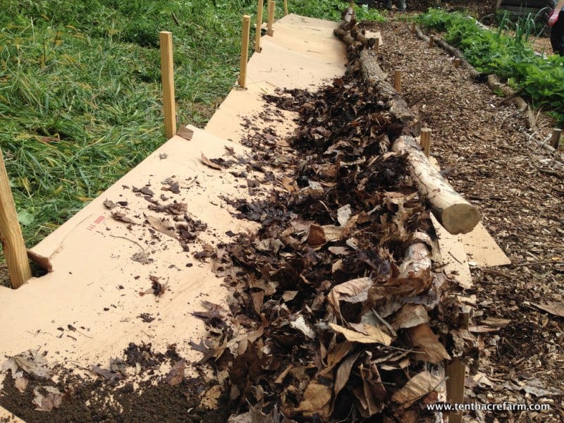 Remplissez les trous entre les branches avec des brindilles, de la broussaille et des feuilles mortes. Cette matière fait office de filtre naturel et évite que la terre ne s’échappe à travers les branches.