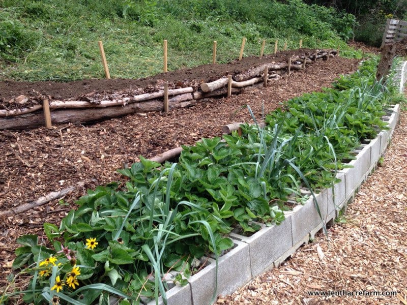 Sur l’exemple ci-dessus, la terrasse inférieure en parpaings accueille des fraisiers, tandis que la supérieure est dédiée aux framboisiers.